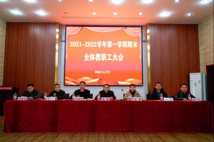 党委书记熊晖从八个方面回顾了不平凡的2021年:一是党建工作水平进一步提升;二是社会服务能力进一步加强;三是教育教学质量进一步提高;四是1+X试点工作取得新进展;五是学生精细化管理和素质教育成效明显;六是教师队伍建设进一步优化;七是后勤服务保障工作进一步巩固;八是平安文明校园建设常抓不懈。