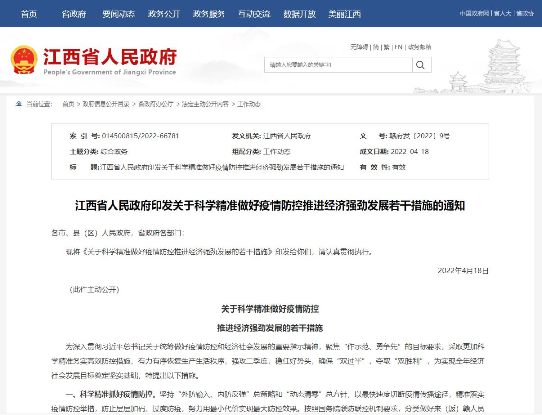 为深入贯彻习近平总书记关于统筹做好疫情防控和经济社会发展的重要指示精神,聚焦“作示范、勇争先”的目标要求,采取更加科学精准务实高效防控措施,有力有序恢复生产生活秩序,强攻二季度,稳住好势头,确保“双过半”,夺取“双胜利”,为实现全年经济社会发展目标奠定坚实基础,特提出以下措施。 一、科学精准抓好疫情防控。坚持“外防输入、内防反弹”总策略和“动态清零”总方针,以最快速度切断疫情传播途径,精准落实疫情防控举措,防止层层加码、过度防疫,努力用最小代价实现最大防控效果。按照国务院联防联控机制要求,分类做好来(返)赣人员和重点人群、高暴露人员管理,加大重点场所的日常检查和风险隐患排查力度,健全多点触发监测预警机制。省内发生疫情的市(县)级宣布全域动态清零后,各地不得对上述区域流入人员采取集中隔离措施等限制措施,在做好个人防护的前提下,可以有序流动。 二、切实做好交通物流保通保畅工作。各地区和有关部门要坚决落实国务院联防联控机制关于保畅通的要求,迅速启动省市县三级调度、路警联动、区域协调的保通保畅工作机制,加强路网监测调度,及时解决路网阻断堵塞等问题,确保交通网络不断、应急运输绿色通道不断、必要的群众生产生活物资运输通道不断。要科学精准做好公路疫情防控工作,不得“一刀切”劝返,未经批准不得关停高速公路服务区、收费站,不得随意限制健康码绿色、行程卡带“*”号货车司机通行。要加强对港口码头、铁路车站、航空机场的集疏货运车辆闭环管理,实行场区—公路通行段—目的地点对点运输,确保港口码头等集疏运畅通。对进出中高风险地区内物资中转站点的货车司乘人员,在严格落实闭环管理措施、24小时内核酸检测阴性情况下,实行通信行程卡“白名单”管理模式,经地级市以上联防联控机制(领导小组、指挥部)审核确认后,不记录在相应时段的通信行程信息。要切实保障邮政、快递车辆通行,有条件的地方可增设无接触投递设施,避免邮件快件积压等情况。 三、全力稳定企业生产。落实属地责任,引导企业合理安排生产进度,鼓励有市场、有效益、有订单的企业开足马力,增加排产计划,提高产能利用率。抓好新投产项目尽快达产稳产,形成新的增长点。主动靠前帮企纾困,重点保障运输、用工、用能、融资等要素供应。用好用足国家和省出台的系列帮扶举措,特别是落实好我省《有效应对疫情帮助中小企业纾困解难的若干政策措施》,确保市场主体尽快享受政策红利。深入实施产业链链长制,有针对性地分行业、分领域开展一批产销对接、产融对接、人才对接等合作活动,进一步疏通产业链供应链堵点淤点,着力增强产业链供应链的韧性和竞争力。强化安全生产,狠抓国务院安委会“15条”硬措施的落实落细,坚决防范遏制各类安全生产事故发生。 四、加快推进重大项目建设。严禁以疫情防控为由,简单粗暴叫停项目施工,确保做到“在建项目不停、施工强度不降、开工时间不拖、协调力度不减、项目谋划不断”,努力推动“项目大会战”取得更大成效。没有发生疫情的地区,要加大施工强度,努力形成更多实物工作量。发生疫情的地区,在落实疫情防控措施的前提下,可采取工地封闭管理等形式,组织项目建设,尽可能减轻疫情对项目建设的影响。对项目推进中遇到的突出问题,要及时梳理,采取一事一议、专题协调等方式,分层级、分类别推动加快解决。要抢抓国家政策靠前发力、适时加力的机遇,抓紧谋划一批“补短板、能落地、快见效”的重大项目。多措并举加强各类要素保障,统筹抓好砂石、建材、设备、用电用气的保障和调配。千方百计加强资金保障,加快各类财政性资金下达、拨付的节奏和进度,特别是加快已发行专项债券资金的支出进度,引导各类金融机构加大信贷支持力度。精准有力优化项目审批服务,并联推进开工前各项手续,最大限度缩短项目审批时限。采取“屏对屏”“不见面”等多种方式加大招商力度,努力引进一批“旗舰型”“领头羊”“独角兽”企业来赣投资。 五、着力加快消费回补。推动住宿餐饮、批发零售等受影响较大的商贸消费领域企业有序恢复经营,做到应开尽开,符合条件的地方可及时放开堂食。组织开展“惠聚江西消费季”活动,举办中国米粉节和“赣品网上行”等系列活动,鼓励发放消费券,大力推广自提、外卖、无接触配送方式。抢抓“五一”、端午等节假日机遇,加快文化和旅游市场恢复。对室外旅游景区,特别是自然类旅游景区,该开放的开放、该经营的经营,引导“江西人游江西”。科学有序开放各类公共文化场馆以及非密闭性文化娱乐场所。推广线上线下融合的新型消费模式,支持在线娱乐、在线教育、远程医疗等新业态加快发展。开展新能源汽车、智能家电、绿色建材下乡。 六、全力做好春耕工作。全面落实各项惠农政策,稳住种粮积极性。加强水稻良种、化肥、农药、农膜、柴油等农资调运储备,做好农机跨区作业衔接,确保1830万亩早稻面积落到实处。加强农业执法监管力度,坚决打击制假售假行为,确保农资价格稳、质量优。各级农业部门要加强对口指导,切实做好油菜、蔬菜、果业、茶叶田间管理工作。 七、扎实做好生活物资保供稳价。落实全省生活必需品等物资供应和价
